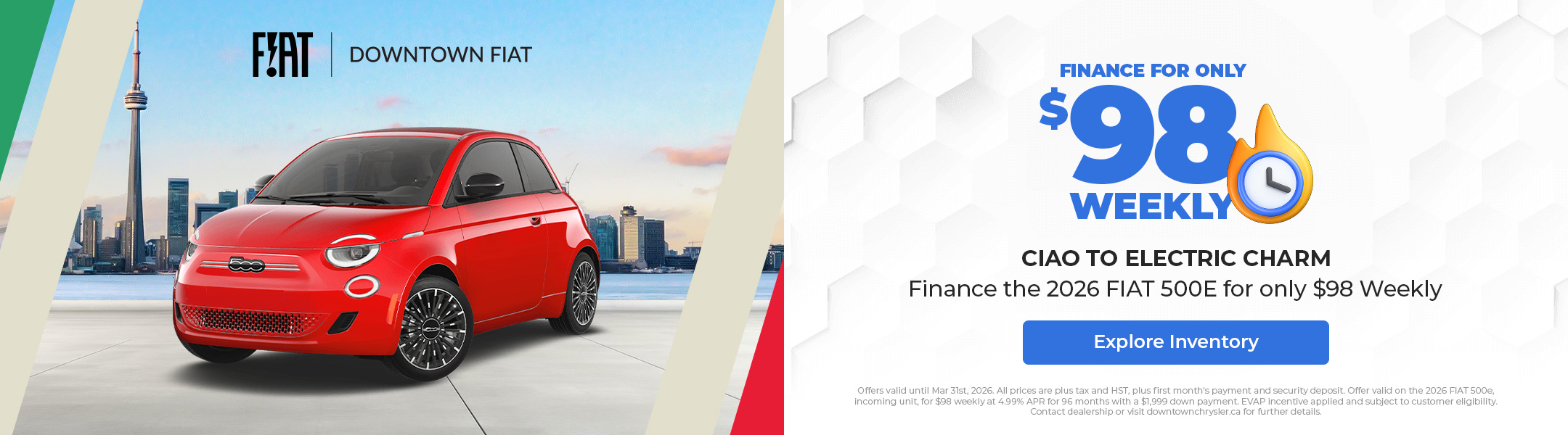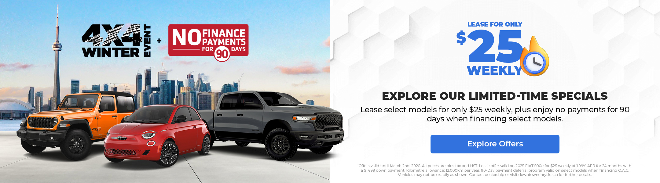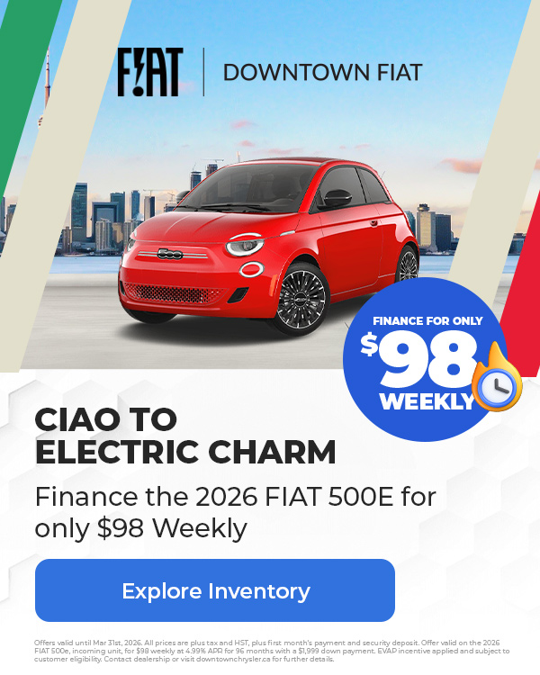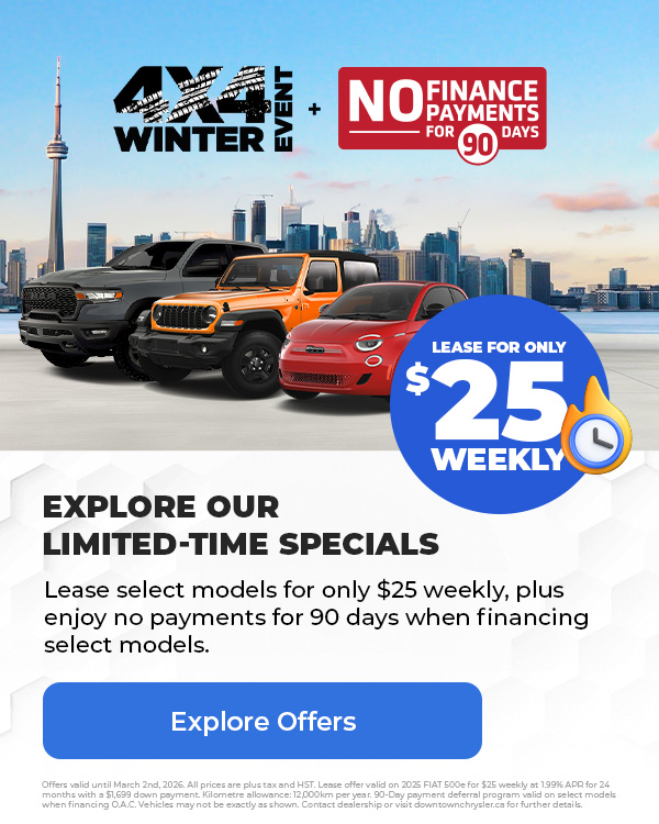 Disclaimer : Finance and Lease offers on approved credit. Regional offers, lease and finance conditions apply. See your local FIAT dealer for more information. Use of any calculation and/or tools on https://www.downtownchrysler.ca does not constitute an offer of direct financing or any particular lease, finance, purchase option or transaction. Calculation and tools are intended for illustrative purposes only. Rates and requirements may vary depending on credit worthiness. Every effort is made to ensure the accuracy of the content on the pages on https://www.downtownchrysler.ca. In the event of a discrepancy, error or omission, vehicle prices, offers and features as established by Chrysler Canada and participating FIAT dealers in Canada, will prevail.