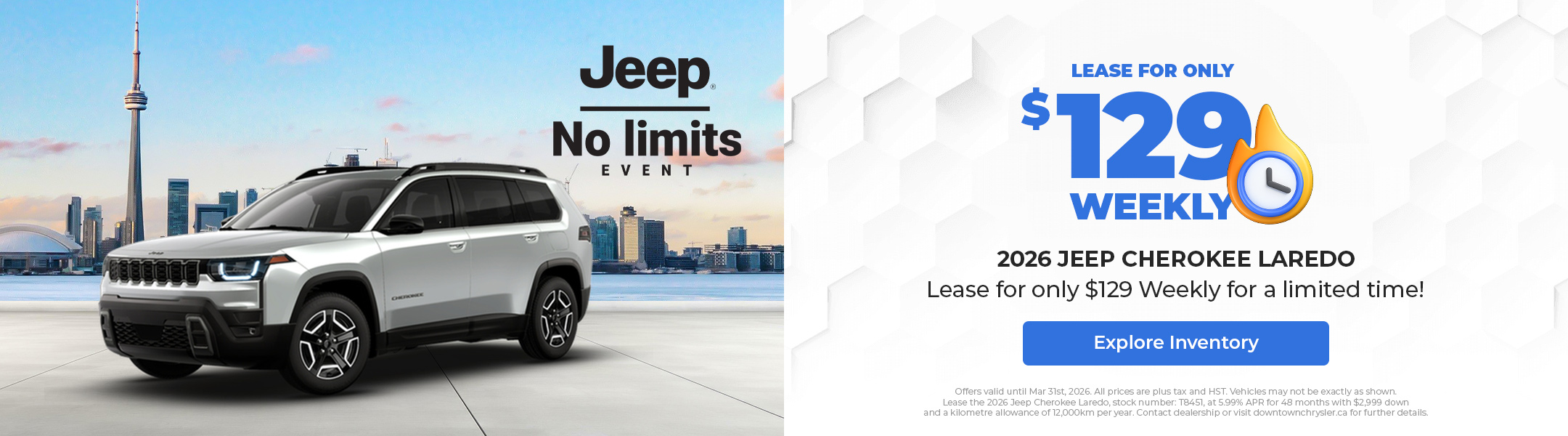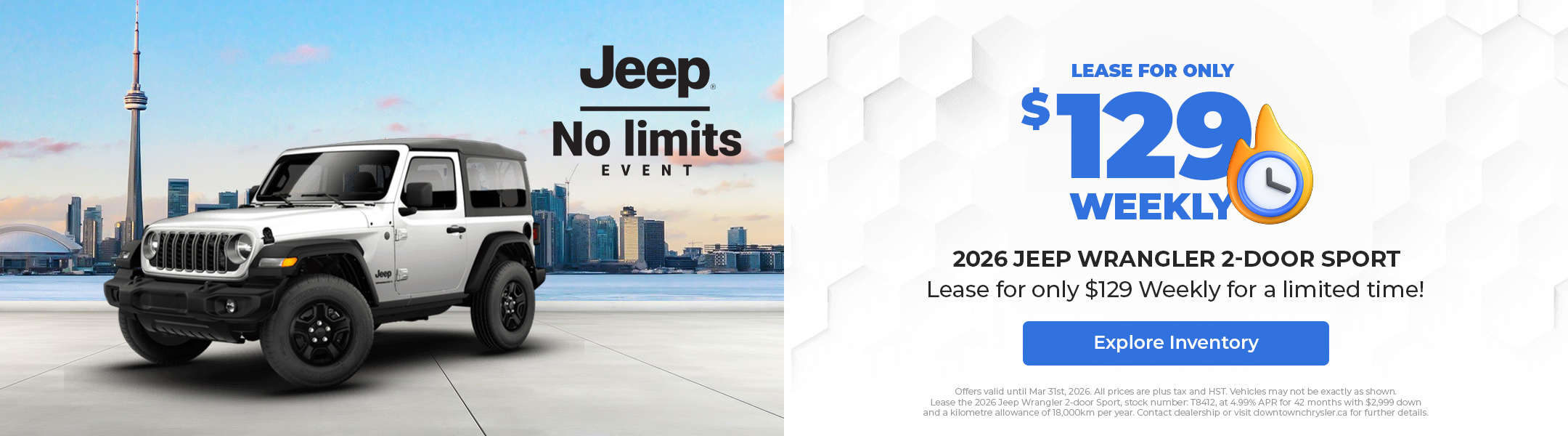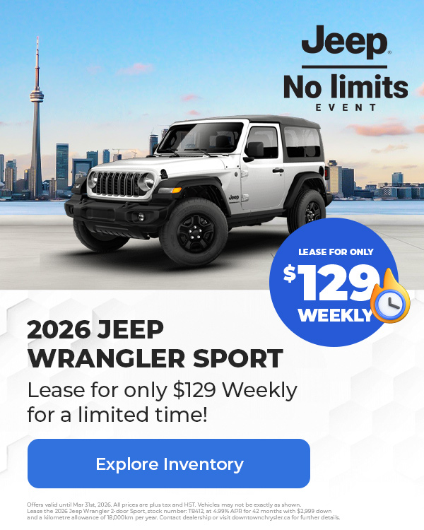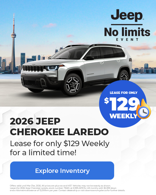 Disclaimer : Finance and Lease offers on approved credit. Regional offers, lease and finance conditions apply. See your local Jeep dealer for more information. Use of any calculation and/or tools on https://www.downtownchrysler.ca does not constitute an offer of direct financing or any particular lease, finance, purchase option or transaction. Calculation and tools are intended for illustrative purposes only. Rates and requirements may vary depending on credit worthiness. Every effort is made to ensure the accuracy of the content on the pages on https://www.downtownchrysler.ca. In the event of a discrepancy, error or omission, vehicle prices, offers and features as established by Chrysler Canada and participating Jeep dealers in Canada, will prevail.